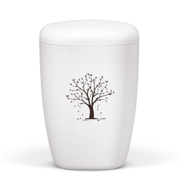 Naturstoffurne, Weiß-Matt, Lasergravur, Baummit fallenden Blätter