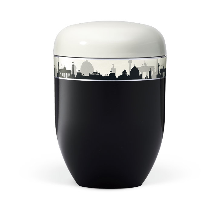 Naturstoff, Korpus Schwarz Deckel Weiß,Dekorband: Skyline BERLIN